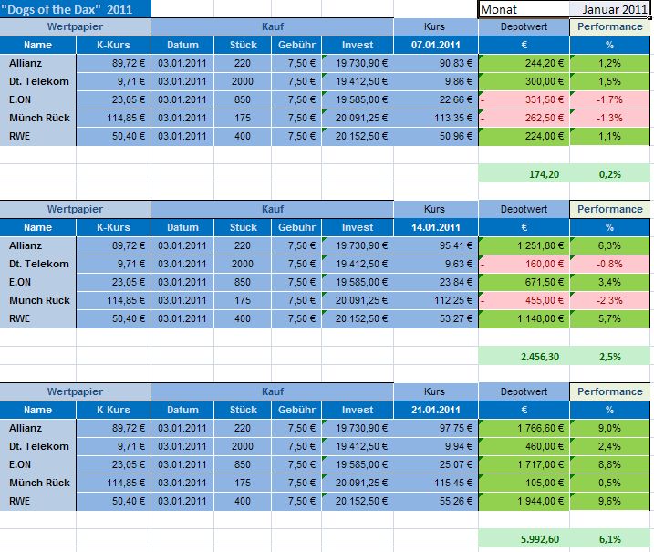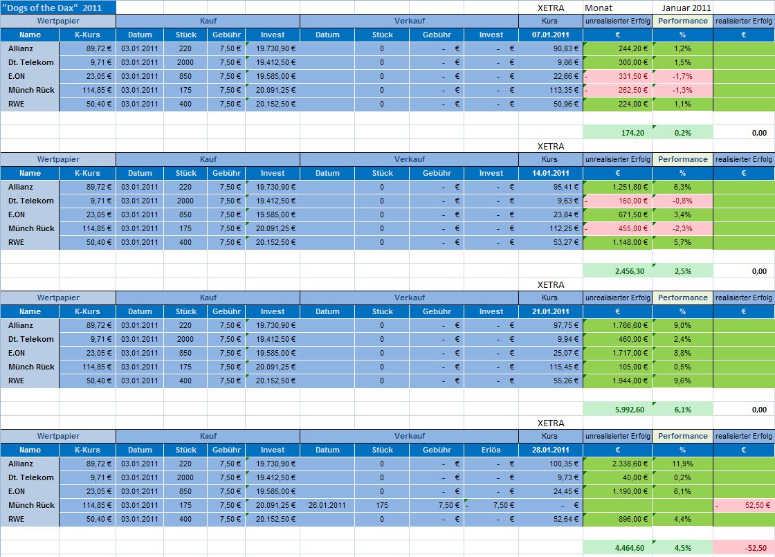 Gestern wurden zwei Dogs wegen Erreichen der StoppLoss-Marken verkauft. Es handelte sich um die DTE und die RWE. "Dogs of the DAX" Depot wurden nicht, wie in Posting #13 berichtet, Zwischengewinne von 9,50 € und 585 € realisiert, sondern von 530 € und 1126 €, insgesamt 1.656 €. Bei den anderen Beträgen handelte es sich um die Gewinnrealisierung im Investor 2011 Depot.