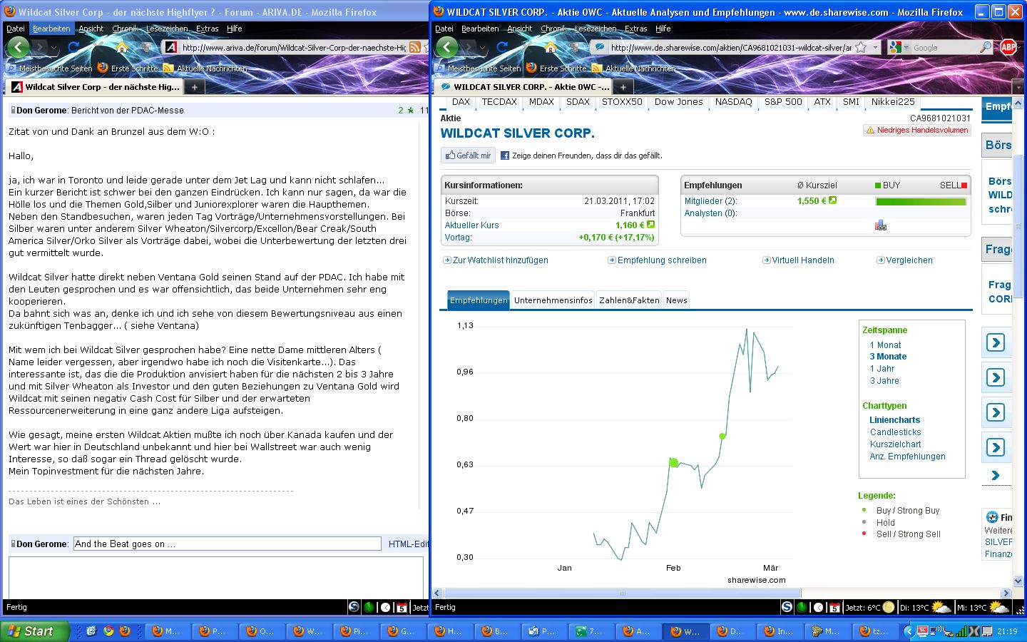 Mit wem ich bei Wildcat Silver gesprochen habe? Eine nette Dame mittleren Alters ( Name leider vergessen, aber irgendwo habe ich noch die Visitenkarte...). Das interessante ist, das die die Produktion anvisiert haben für die nächsten 2 bis 3 Jahre und mit Silver Wheaton als Investor und den guten Beziehungen zu Ventana Gold wird Wildcat mit seinen negativ Cash Cost für Silber und der erwarteten Ressourcenerweiterung in eine ganz andere Liga aufsteigen.
