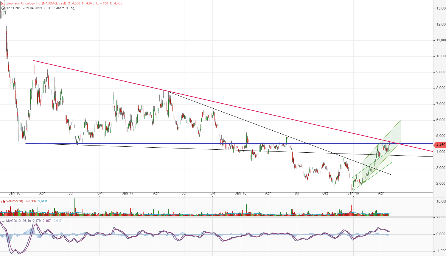 Über den heute zwischenzeitlich erreichten 4,67$ besteht eine gute Chance auf nachhaltigen Ausbruch.