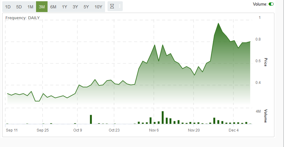 Big Wind war die Tage schon fast bei 1cad$ dann gab’s etwas Abkühlung. Volumen ist noch etwas Mage. Ich denke aufgrund da noch sehr wenige die auf dem Schirm haben.