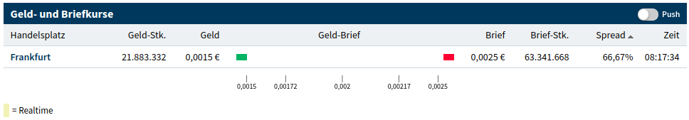 Habe seit Tagen versucht, mehrere Millionen davon für 0,0015 zu bekommen und hatte keine Chance. Mehr wollte ich aber auch nicht ausgeben. Bei der Aktienanzahl von 6.3 Milliarden Stück ist das aber auch echt nur ein Zock. Da muss schon einiges über den Tisch gehen um den Kurs zu bewegen.
