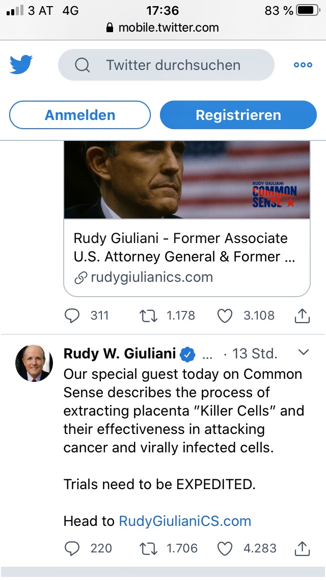 Vor wenigen Stunden hat Rudy Giuliani, einer der Anwälte von D. Trump Stammzellen basierte Therapieformen für Covid-19 (plus Erwähnung Plazenta Bezug) empfohlen und beschleunigte Initiative in die Richtung empfohlen, siehe auch https://mobile.twitter.com/RudyGiuliani