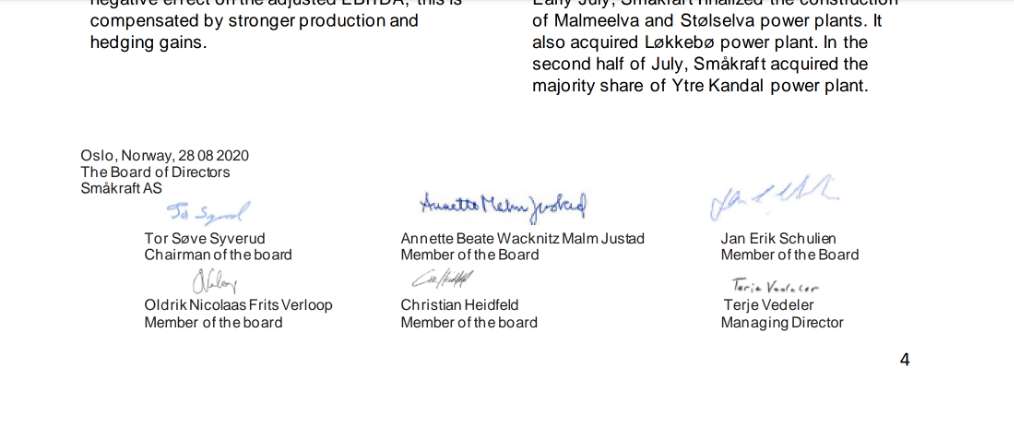 im Jahr 2020 zusammen mit dem neuen Aufsichtsrat Tor Syverud im Board of Directors bei der norwegischen Smakraft AS, einem der großen Betreiber von Kleinwasserkraftwerken (mittlerweile mehr als 200). Dies geht aus dem Geschäftsbericht H1 2020 hervor: