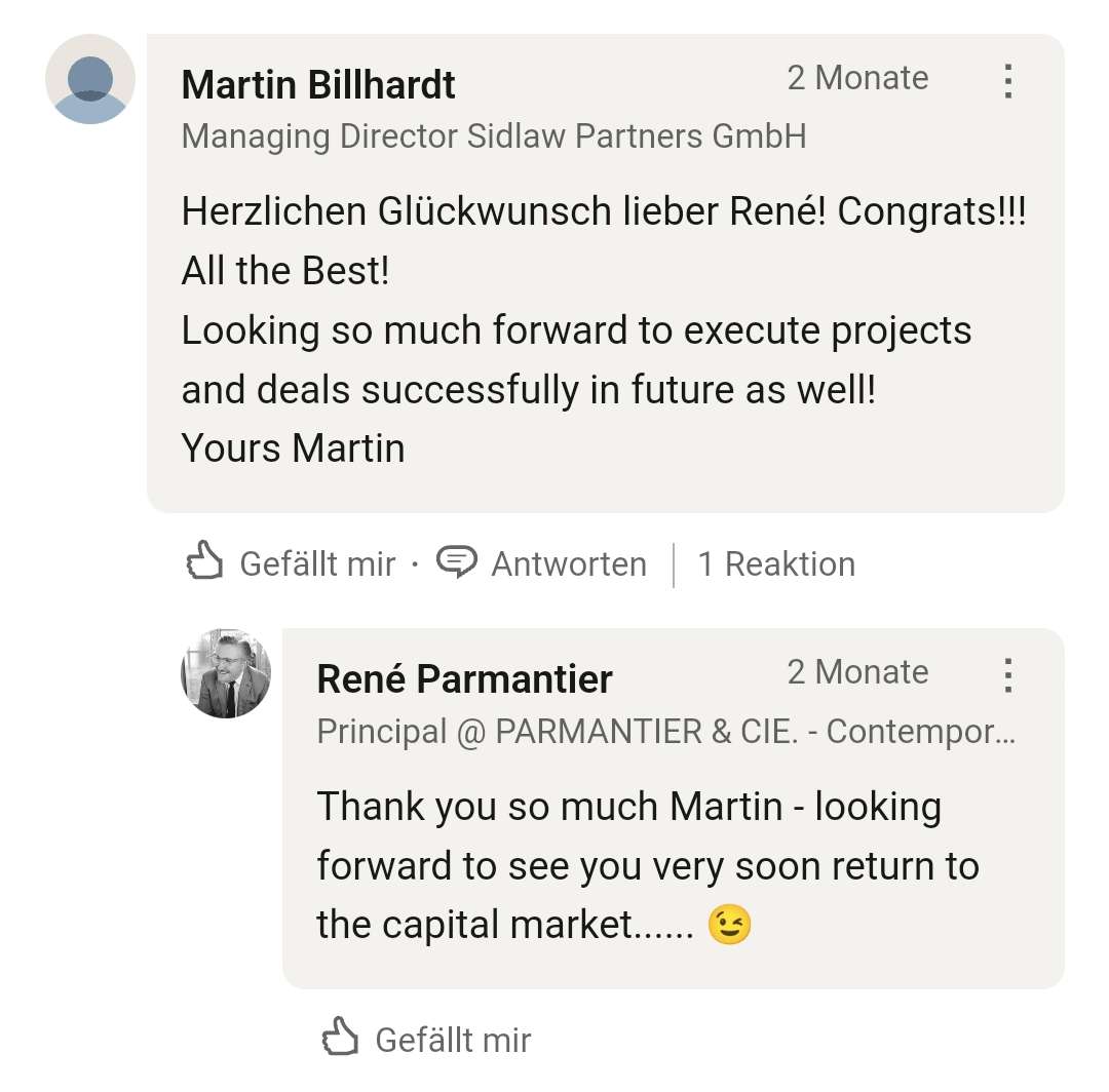 Der neue Aufsichtsrat Martin Billhardt, früher u.a. CEO bei PNE Wind, kennt Parmentier sehr gut, wie man beigefügten LinkedIn- Kommentaren aus dem Mai 2024 entnehmen kann. Die nächsten Deals stehen an, ggf. auch hier zusammen bei der DWK.