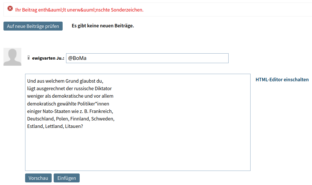 Ich lege Wert auf ruhige Diskussionen. Werde ich beleidigt, antworte ich nicht mehr.