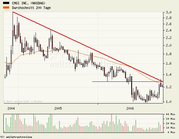 Rückblick: Die CMGI Aktie vollzog in diesem Sommer nach mittelfristiger Abwärtsbewegung eine Bodenbildung bei 0,99 $, wobei das Abwärtsziel bei 0,92 - 0,93 $ nicht ganz erreicht wurde. Heute springt die Aktie unter hohen Umsätzen direkt über die 1,14 $ Marke und an den Kreuzwiderstand bei 1,21 - 1,22 $. Dieser gilt als mittelfristiger BUY Trigger, da hier auch der Abwärtstrend Dezember 2004 verläuft. Das mittelfristige Chartbild ist aber nach wie vor bärisch zu werten, so lange die Aktie nicht nachhaltig über 1,21 - 1,22 $ ausgebrochen ist..