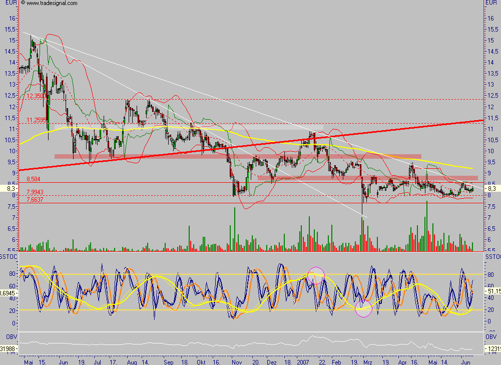 Kurzkommentierung: Die GCI Aktie befindet sich seit dem 12.05.06 in einem stetigen Abwärtstrend. Innerhalb dieser Abwärtsbewegung setzte der Wert mehrere Male auf einer horizontalen Unterstützung bei 7,92 Euro auf. Das Kursbild innerhalb des letzten Jahres ähnelt einem fallenden Dreieck, was innerhalb der langfristigen Aufwärtsbewegung der GCI Aktie für ein positives Fortsetzungsmuster stehen könnte. Aktuell nähern sich Unterstützung und Abwärtstrendlinie an, es steht eine Richtungsentscheidung für die Aktie an. Die Marktteilnehmer sind noch unentschlossen, was sich in fallenden Umsätzen widerspiegelt. Sollte es der GCI Aktie jetzt gelingen den Abwärtstrend zu durchbrechen und das fallende Dreieck somit aufzulösen sind Kursgewinne bis zum Allzeithoch bei 15,25 Euro möglich. Voraussetzung hier für ist ein Wochenschlusskurs oberhalb der Widerstandslinie bei 9,59 Euro. Fällt der Wert allerdings wider Erwarten unter die Unterstützung bei 7,92 Euro zurück, ist ein erstes Kursziel von 6,18 Euro mit anschließendem Wiederanstieg wahrscheinlich.