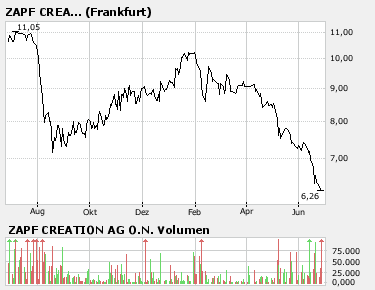 Der Zapf Creation-Konzern weist für den Zeitraum Januar bis Juni 2006 ein Periodenergebnis nach Steuern von -10,9 Mio. EUR aus nach -11,6 Mio. EUR im gleichen Zeitraum 2005. Im zweiten Quartal konnte das Periodenergebnis von -8,6 Mio. EUR auf -5,6 Mio. EUR verbessert werden.