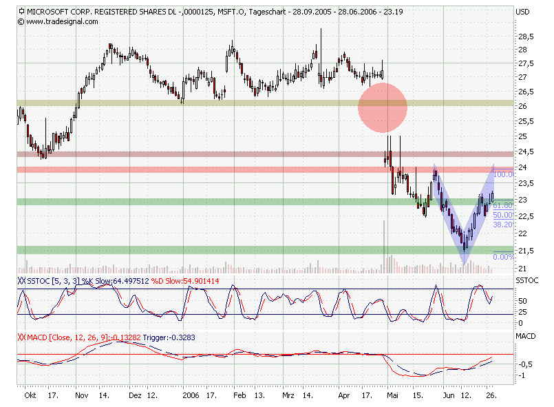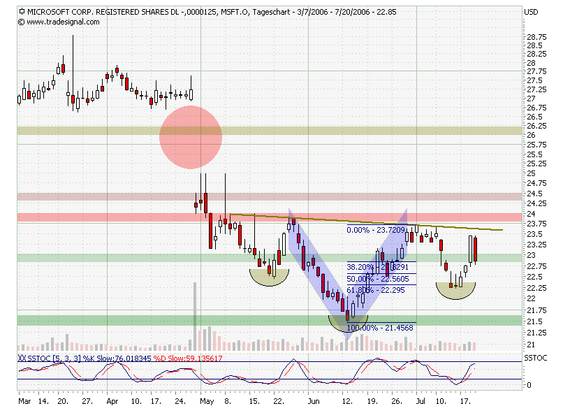 Mag sein, dass MSFTs Wachstum begrenzt ist und der Kurs insofern gedeckelt. FALLEN dürfte die Aktie aber nicht. Bei der Dutch Auction bis Herbst (Rückkauf von Aktien im Wert von 20 Mrd. Dollar) ist die untere Schwelle der Preis-Range 22,50 Dollar. Tiefer dürften die Papiere vorerst nicht mehr sacken.