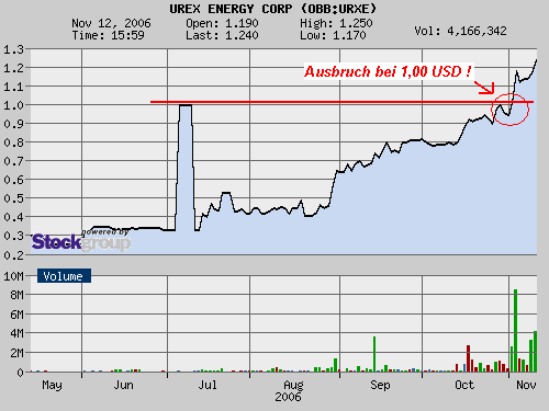 Trotzdem steigt Texola seit ca. 2 Wochen. Dieser Trend kann sich aber mit hohem Volumen noch mehr verstärken. Ich vermute, dass spätestens mit dem im Dezember beginnendem Bohrprogramm das Volumen ansteigen wird. Wenn der Dollar bricht, und die Taxe winkt bereits mit dem Scheunentor (1,01 x 1,09), wird der Kurs schnelle Richtung 1,1-1,2 hochschiessen. Bestes Beispiel ist URXE. Siehe Chart unten: Mit dem Bruch der Dollarmarke kam auch das Volumen: