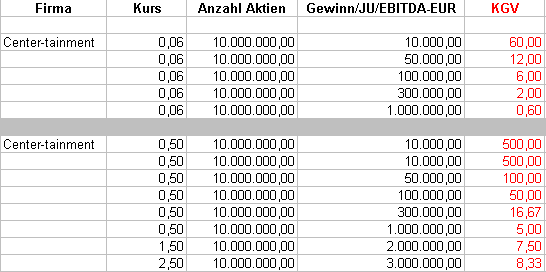 durch den börsengang hat center-tainment auf jeden fall mind. 100.000 kassiert. erstnotiz hatten wir bei 1,25 -> 12.500.000 euro. dieses geld muss noch in der firma sein. sie haben ja noch nichts ausgegeben, ausser vielleicht miete für 3 monate und sagen wir 20.000 für andere sachen. bei einem gewinn von 100.000 haben wir hier einen kgv von 6, bei dem jetzigen kurs. vergleichbare firmen haben einen kgv von 40, also fast 7x höher. hier die tabelle: