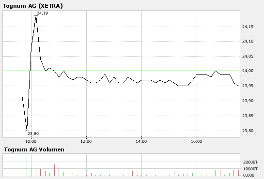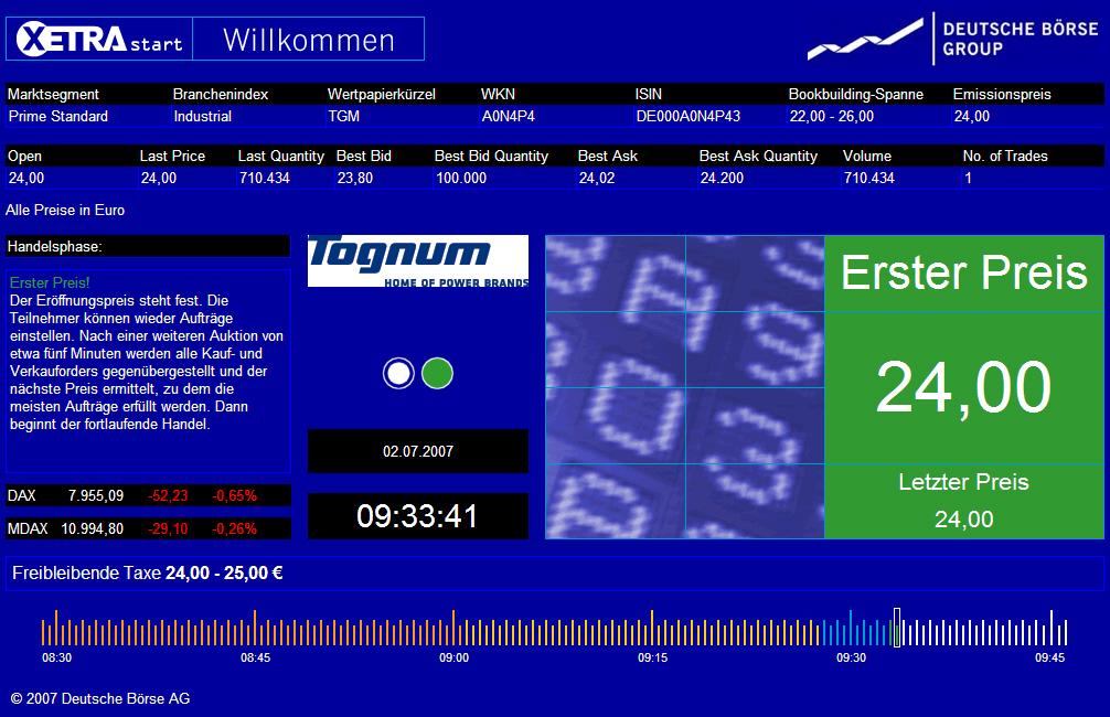 Der MDAX-Kandidat mit der Kernmarke MTU war Anfang 2006 von DaimlerChrysler an den schwedischen Finanzinvestor EQT verkauft worden. Dieser brachte das Unternehmen am 2. Juli an die Börse. Der Börsengang war mit einem Brutto-Emissionserlös der größte seit sieben Jahren. Die Tognum-Aktie stieg am Dienstagvormittag um 4,87 Prozent auf 23,70 Euro, lag damit aber immer noch 30 Cent unter dem Ausgabepreis./stw/zb