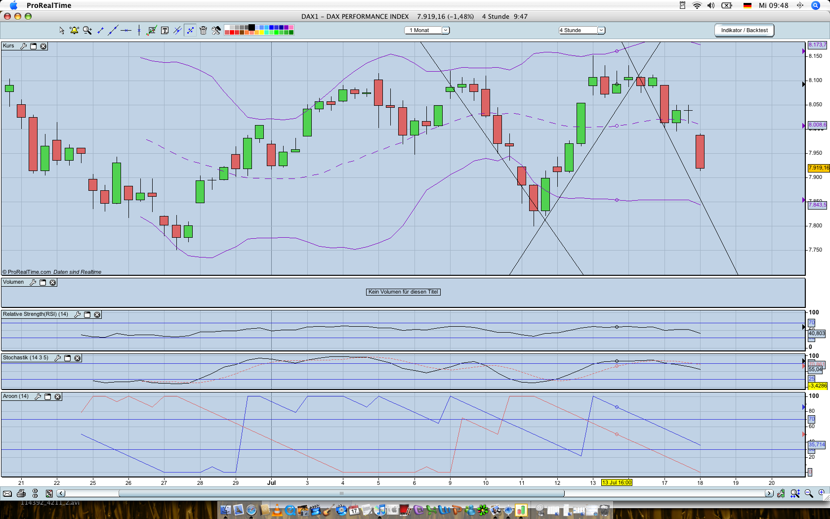 Sehen wir es doch mal realistisch: Kurz nach dem so schwer überwindbaren ATH im DAX ist es nur allzu verständlich dass der DAX eine Verschnaufspause braucht. Die meisten sind auf eine Seitwärtsbewegung eingestellt, der Dax hat dies Jahr schon eine gute Rally gemacht, viele hoffen jedoch gerade deshalb auch auf eine Korrektur --> ABER, die Liquidität ist immernoch extrem vorhanden und AKtien sind nach wie vor die betse Anlage.. Gute Indikatoren sind hierbei die Umschichtung in festverzinl. Anleihen und schaut euch doch mal den Bund-Future an, auch kurzfristiger Natur und ihr werdet feststellen dass die Umschichtungen gerade im Bund-Future lediglich charttechnische Reaktionen im langfristigen Abwärtstrend sind, da ist es klar dass solche Gelegenheiten zur erhofften Trendumkehr diverser Investoren genutzt werden, jeder will ja der erste sein der den Boden finden und eine gute ABsicherung ist es noch obendrein, dann kommen da noch die "Treder" hinzu etc... Soviel zu den Bunds... Zum anderen ist Sommerpause, nach einer solchen Rally will doch niemand seine Gewinne im Urlaub (als Privatanleger, die wenigen die dabei sind) vermiesen lassen. Viele Langfrist-Investoren bleiben zwar NATÜRLICH investiert, was ich aber damit sagen will. Trotz dieser Tatsachen die gegen einen Anstieg des DAXes sprechen, hoher EURO (obgleich ich diesen momentan soager eher positiv für den DAX sehe) und der "hohe" Oilpreis (obgleich dies ebenfalls relativ zu sehen ist) hält sich der DAX extrem hoch. Was jedoch gestern üassiert ist ist sollten wir im AUge behalten.. Der DOW stieg auf ein neues ATH aber da der DAX schon so schlecht gestertet ist hat man regelrecht gesehen dass er im Momentum nicht nach oben teriben kann und will, er hat förmlich diesen kurzfristigen Kursrückgang gebraucht, die amerik. Futures gaben dann noch den Rest. Wenn die amerik. heute eine ebenfalls längst fällige Konsolidierung sehen sollte wird der Dax noch weiter fallen, aber gerade dann wäre es Zeit für einen erneuten Einstieg, denn dann treiben die Kräfte wieder nach oben. Denke der gestrige Zeitpunkt zum vermehrten Verkauf wurde aufgrund der übertriebenen Reaktionen auf den Bericht des europäischen Wirtschaftinstituts (heißt das überhaupt so?) zum konjunkturellen Höhepunkt gewählt. Klar gibt es jetzt auch fundamental eine Konsolidierung, aber auf extrem hohem Niveau.. Ich hoffe ebenfalls auf einen Kursrückgang, aber dass wir diesen sehen sehe ich als sehr unwahrscheinlich, vorerst geht die Sommerrally weiter, bis hin zum Winter würde ich gar für wahrscheinlich halten- und dann Crash aufgrund äu0ßerlicher Bedingungen (Krieg wäre ein sinnvioller Auslöser).