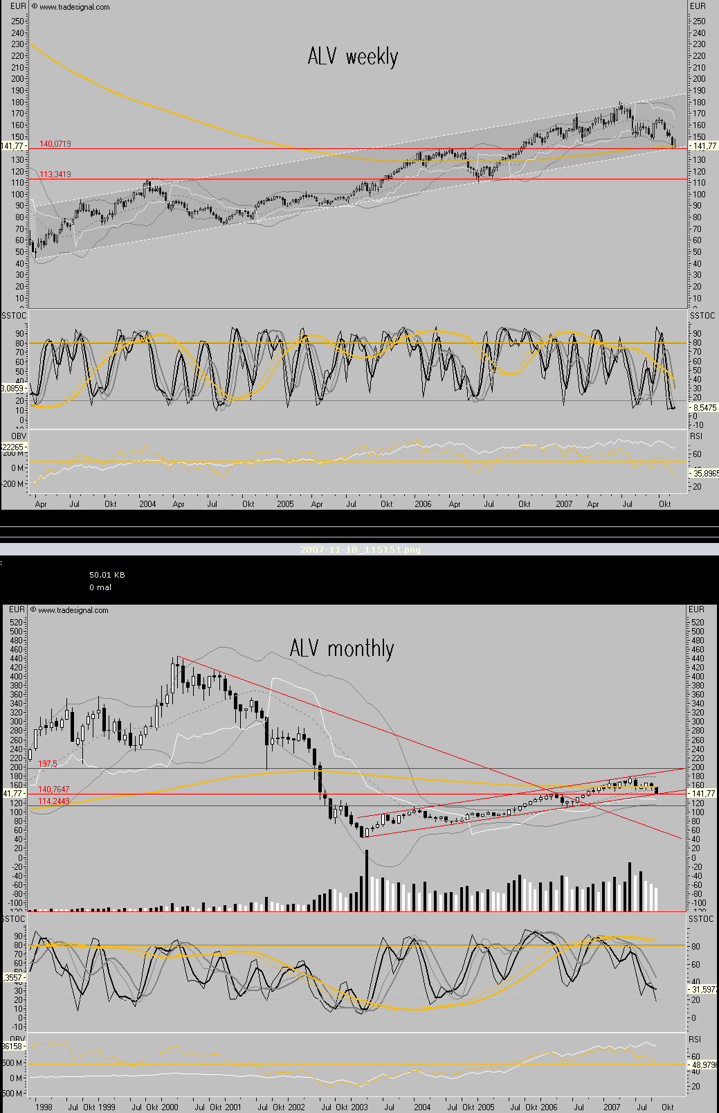 wie wichtig für die ALV die ca. 140 ist, wird im mothly klar, hälts dort nicht, ist sogar 114 denkbar und wahrscheinlich? Zwischen 114/115, 128 und 140 sollte eine ziemliche Volazone sein und wenn die ALV hier durchbricht (140), bin ich mir ziemlich sicher, daß die anderen Financials folgen würden, allerdings hat die DBK aktuell ein KGV von 7,5 und eine Dividendenrendite von ca. 5, insofern ist es dezeit nur mit einer Ausweitung der Finanzkrise denkbar, quasi als Spike, ansonsten würde ich bei solchen Schnäppchen annehmen müssen, daß das Wachstum der Weltwirtschaft rückläufig würde?