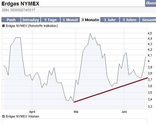 Erdgas hat gegenüber Öl noch starkes Nachholpotenzial. Wenn also Öl jetzt noch mal nach oben ausbricht, gehts ab bei Ergas. Bin im April bei ca. 3,70 eingestiegen.... schau mer mal :-)