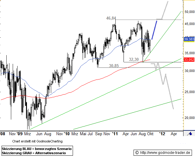 Im Januar 2011 erreichte die Aktie ihr aktuelles Allzeithoch bei 46,84 Euro. Danach kam es zu einem dieser größeren Rückschläge. Die Aktie fiel bis März 2011 auf 32,30 Euro zurück. Diese beiden Marken, das Hoch bei 46,84 Euro und das Tief bei 32,30 Euro, stellen die Begrenzungen einer breiten und volatilen Seitwärtsbewegung dar. Im August setzte die Aktie auf der unteren Begrenzung auf. Seitdem befindet sie sich in einer kurzfristigen Aufwärtsbewegung.