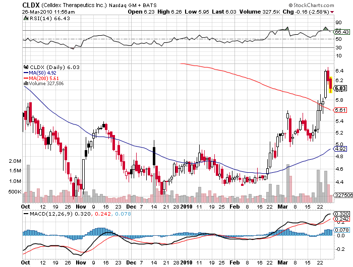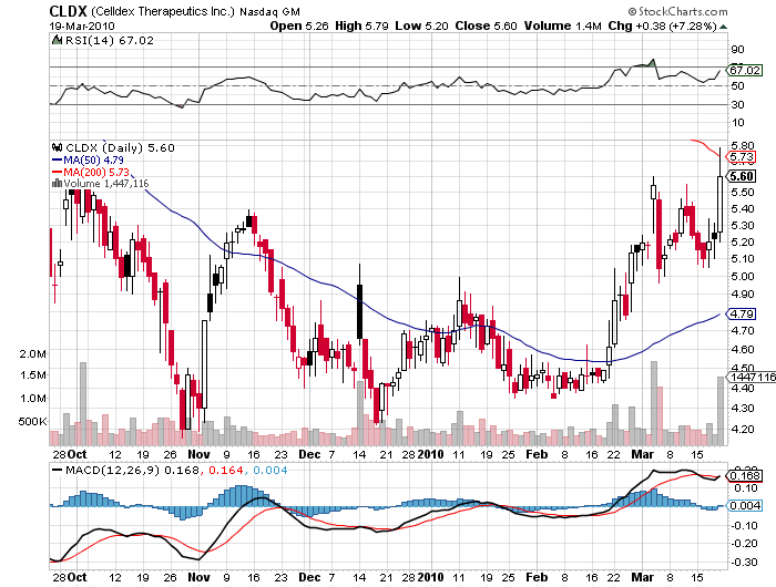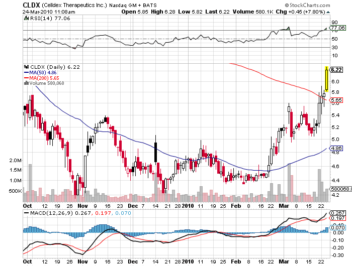 Mystery "On the mystery moves, or at least on moves with no real news on the tape… Celldex Therapeuti­cs, Inc. (NASDAQ: CLDX) is up over 8% at $5.65 on 1.1 million shares versus a 52-week trading range of $4.16 to $14.19 and versus average volume of 360,000 shares."