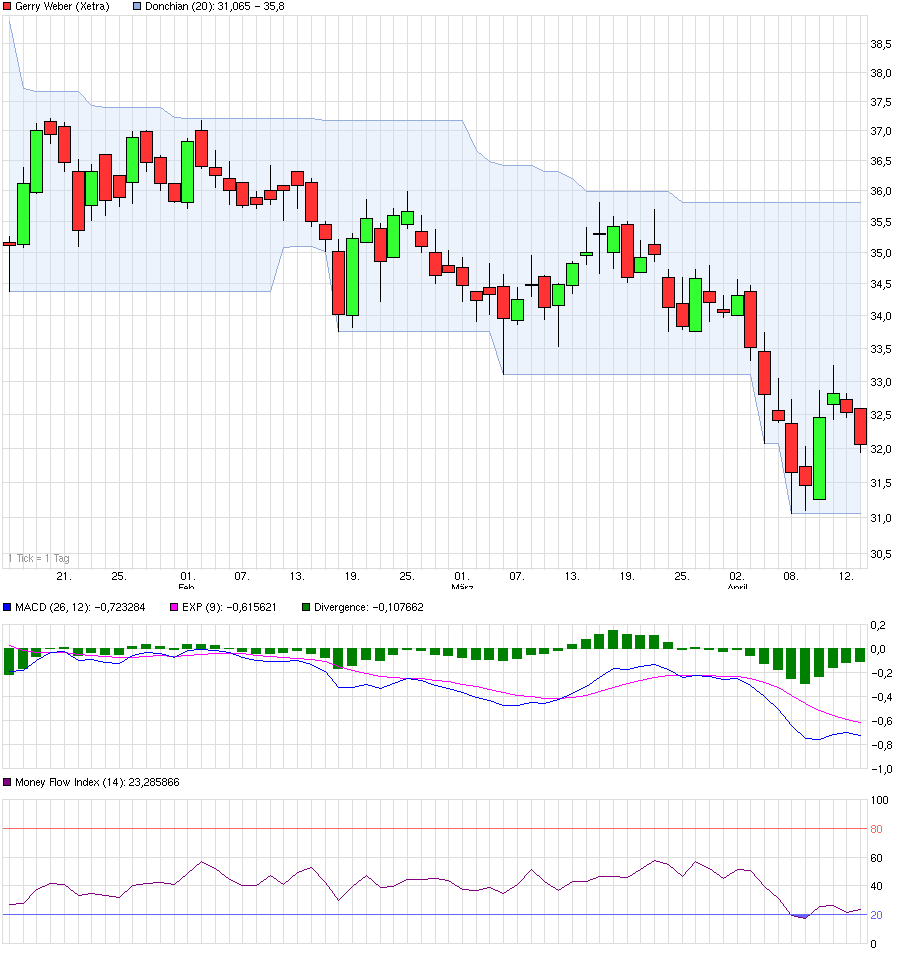 Hallo, da ich Gerry Weber schon eine Zeit beobachte, habe ich heute 100 Aktien zu 32,46€ gekauft.