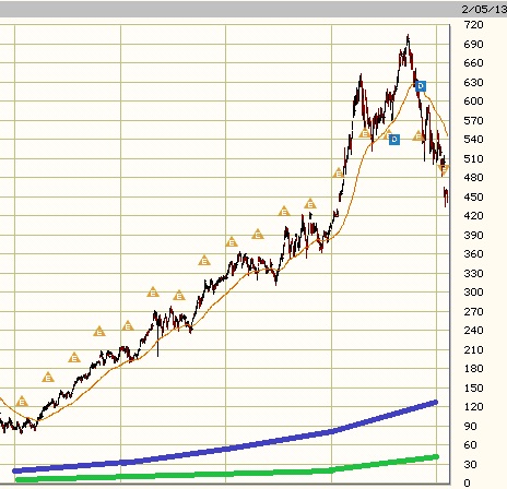 Ich habe mal mit einem Chart gespielt und Buchwert ( Blau ) und Gewinn je Aktie ( Grün ) in einen Chart eingefügt, nicht logarithmisch sondern im richtigen Verhältnis