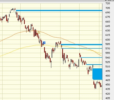 Es gibt ein Gap zwischen 410 und 420 USD und haufenweise Gaps bei 500 -700 USD..