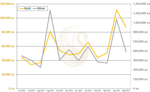 ""Die Silber-Verkaufszahlen beliefen sich im vergangenen Mai auf 587.454,82 Unzen (18,27 Tonnen). Der Absatz lag damit 46,7 Prozent unter Vormonat, aber 34,3 Prozent über dem Mai des Vorjahres.""
