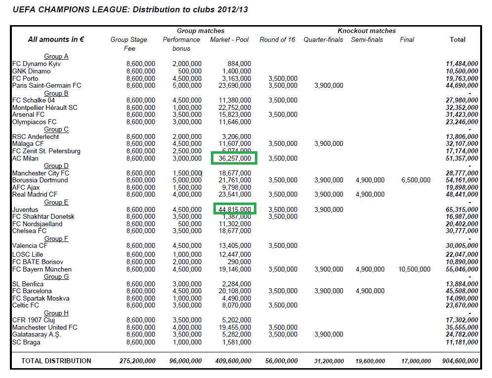 Nehmen wir an dass Roma als zweiter dazustosse würde, und Napoli über der Quali als dritter Italienische Vertreter dazu kommt, dann wäre für jeden Verein im Schnitt etwa 27 Mio. verfügbar.