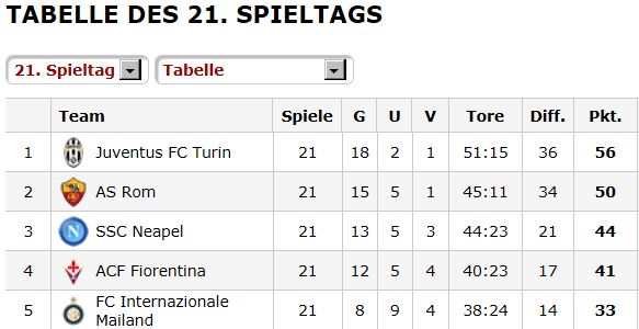 damit 6 Punkte Vorsprung für die direkte CL-Qualifikation und mind. 7 Punkte auf den EL-Platz... Wenn Florenz heute auch noch patzt, ist es ein optimales Wochenende...