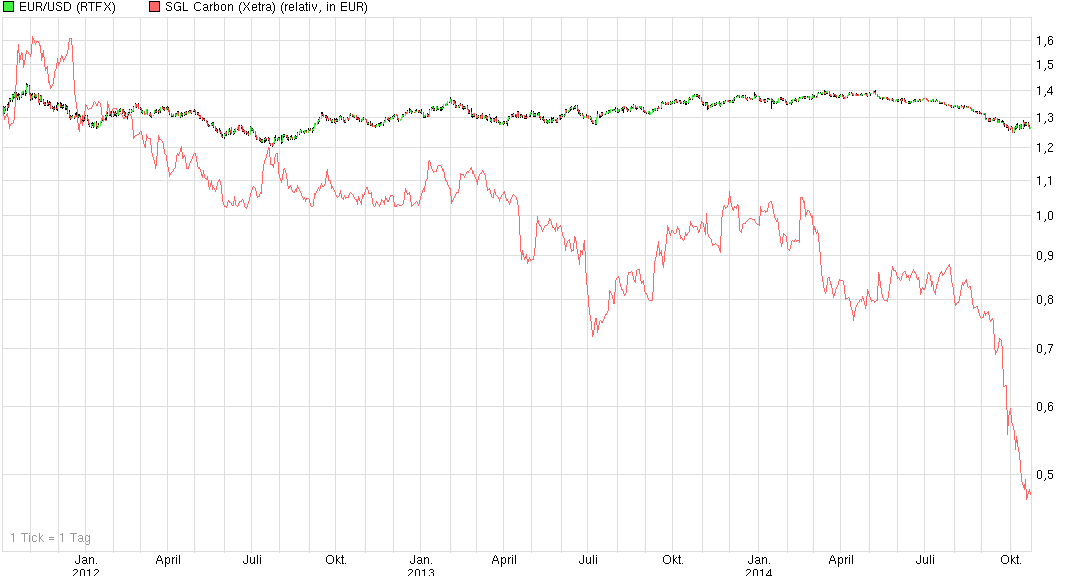 Den aktuellen Kursverfall sehe ich eher dem starken USD geschuldet. Der Kurs von SGL Carbon läuft parallel zum Euro-Dollar-Wechselkursverhältnis: Ist der Euro stark, steht der Kurs hoch, schwächelt der Euro, schwächelt der Kurs. Dabei haben wir derzeit gleich niedrige Kurse wie in 2008, als der Dollar auf dem gleichem Niveau wie jetzt notierte.