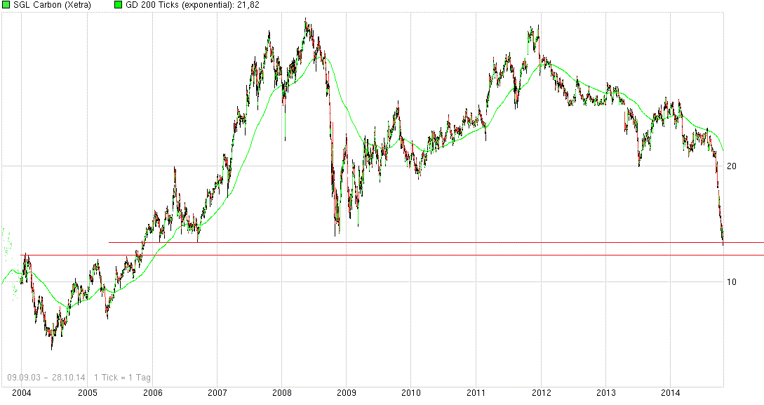 Nachdem die scheinbar bombensichere Unterstützung bei 13,20 Euro, dem Doppeltief vom Oktober-November 2008 (zumindest temporär) unterschnitten wurde (obwohl damals der Weltuntergang eingepreist wurde und obwohl SGL damals seine Großaktionäre noch gar nicht hatte, ebensowenig, wie die Carbon-Fantasie), stellt sich die Frage, wo der Absturz enden könnte.