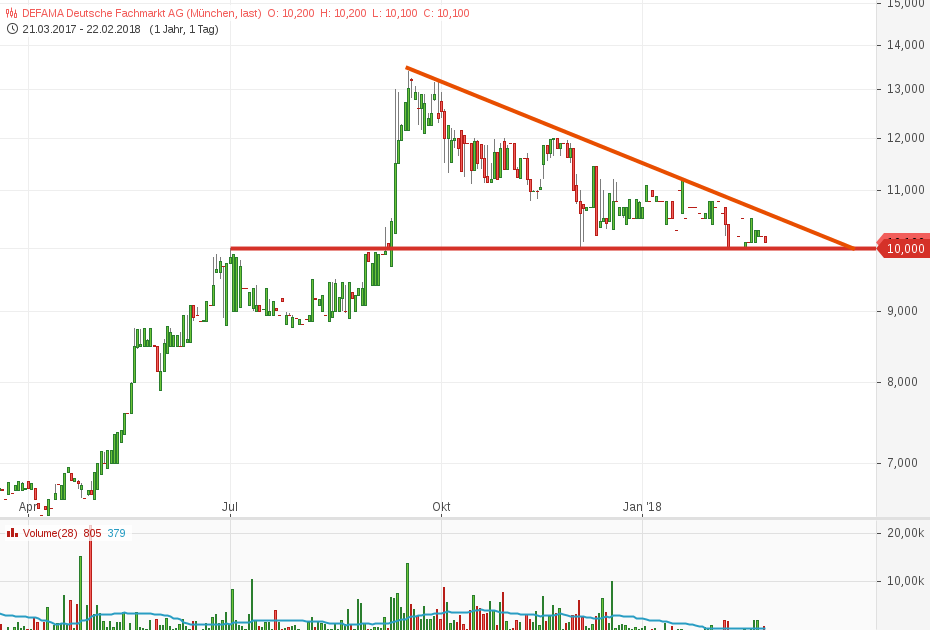 Bin mal mit einer kleinen Position bei 10,10€ eingestiegen. Ich denke mal, dass man in diesem Bereich mit einem Kauf nicht viel verkehrt machen kann. Die 10€-Marke ist ne dicke Unterstützung im Chart und sollte der Boden für den nächsten Aufwärtsimpuls sein. Da fallende Dreiecke häufige Konsolidierungsformationen in Aufwärtstrends sind und in der Regel nach oben aufgelöst werden, sollte hier demnächst wieder etwas Bewegung reinkommen.