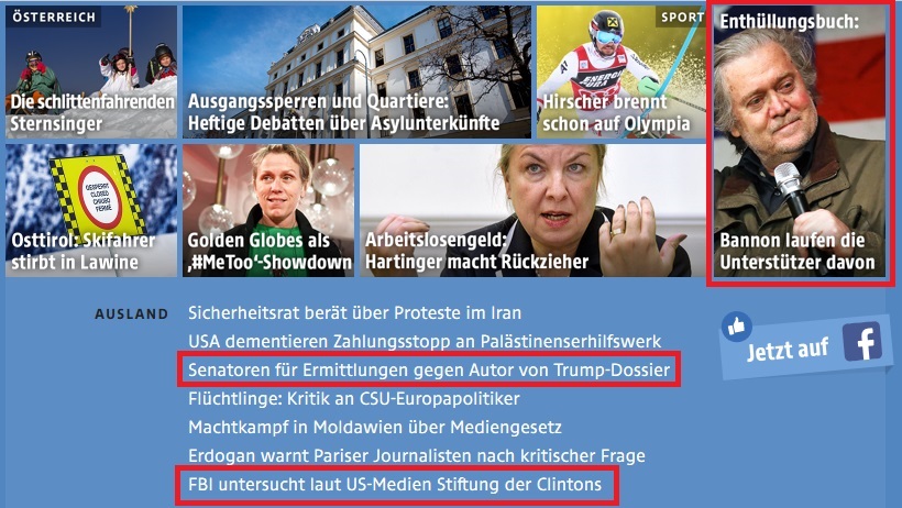 ORF lenkt nicht nur elegant vom Thema "FISA-Memo" ab, sondern bemüht sich wieder mal mehr Motivation zur "Russlandaffäre" zu liefern, indem wieder hoffnungsvoll die Euphorie zum "Trump-Tower"-Treffen anbringt: "Mueller nimmt Trump-Tower-Treffen unter die Lupe" sowie "Widersprüche in Verteidigungslinie"