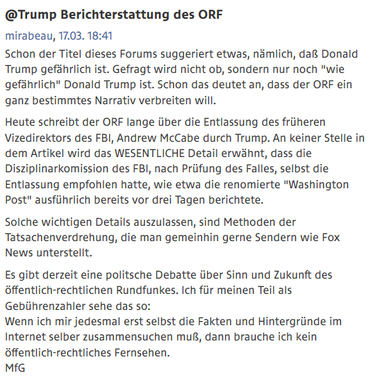 Der privilegierte ORF-Jünger ukglobal, welcher dort sehr auffällig seit geräumter Zeit die übereinstimmenden "Bashen"-Botschaften des ORFs analog propagiert - zwar auf seiner Art ("Mogul", "Dotard Trump", "entlarvt sich der Idiot taeglich auf Twitter"), kommt offensichtlich übermäßig in den privilegierten Genuss der Sonderstellung.