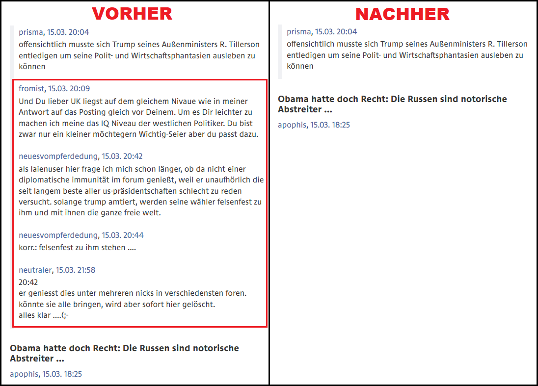 Zur subversiven Manipulation gibt es in diesem Thread bereits reichliche Beispiele, insofern mal Zeit auch Beispiele zur Zensur gleichermaßen mal festzuhalten.