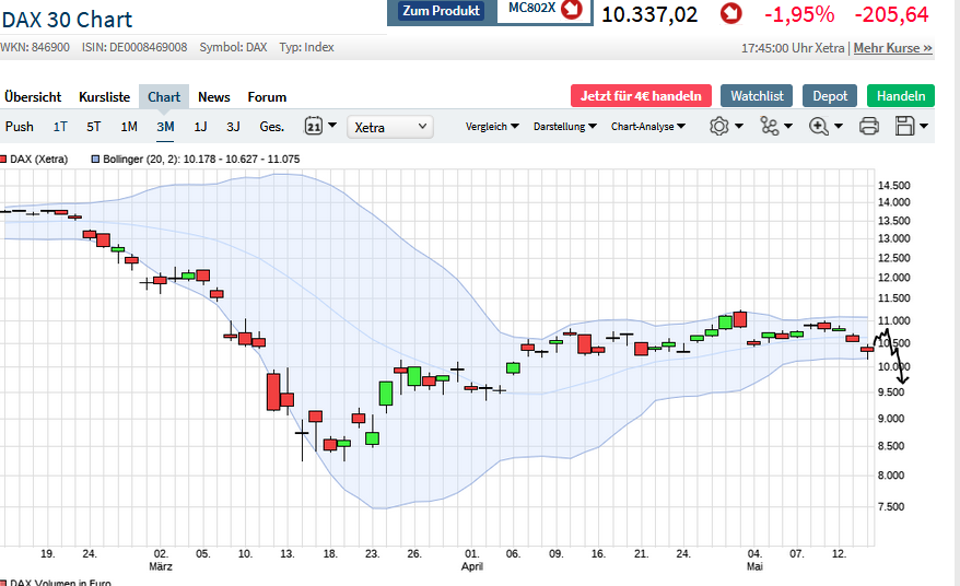 Das bedeutet für die nächsten Handelstage: Gelingt es dem Kurs per Tagesschlusskurs darüber zu notieren, dürfte ein Trendwechsel gelingen und weitere Kursanstiege zur Folge haben. Ob das kurstechnisch gelingt, wird morgen auch von den Q1-Zahlen abhängen. Lassen wir uns überraschen.
