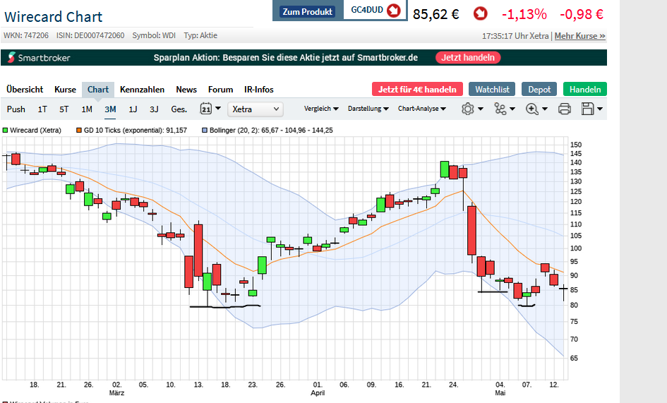 Ich habe mir soeben den 3-Monatschart von Wirecard angeschaut. Dabei ist mir aufgefallen, dass die 10-Tagelinie (orangene Linie im Chart) ein kurzfristig besonders trendbestimmender Faktor war. Solange der Kurs darüber notierte ging es tagelang bergauf. Ist der Kurs darunter gefallen, ging es hingegen zielstrebig abwärts.