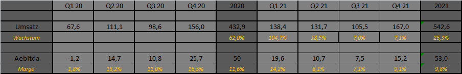 Aber wie gesagt, ich kann es nicht abschließend beurteilen, finde aber 7% Wachstum im 2.Hakbjahr 2021 generell für machbar, trotz der hohen Basis aus dem letzten Jahr. Im Jahr 2022 werden wir, wie von dir schon angesprochen, diese hohe Basis noch in Q1 sehen, so dass das Wachstum da auch noch relativ bescheiden aussehen dürfte, aber in den Quartalen danach wieder anzieht, so dass ich mich mit meinen 12% Wachstum ganz wohl fühle. Das würde nach meiner neuen Prognose dann einem Umsatz von 608 Mio € entsprechen und einem EV/Umsatz von 1,1 und EV/Ebitda von 11 entsprechen.