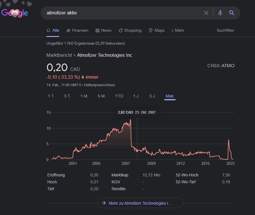 Der CEO hat geantwortet und meint, dass der Verlauf vor November 2021 nicht auf Atmofizer bezogen ist, sie sind im Nov. 2021 an die Börse gegangen. Somit sind die Google Daten da wohl falsch.