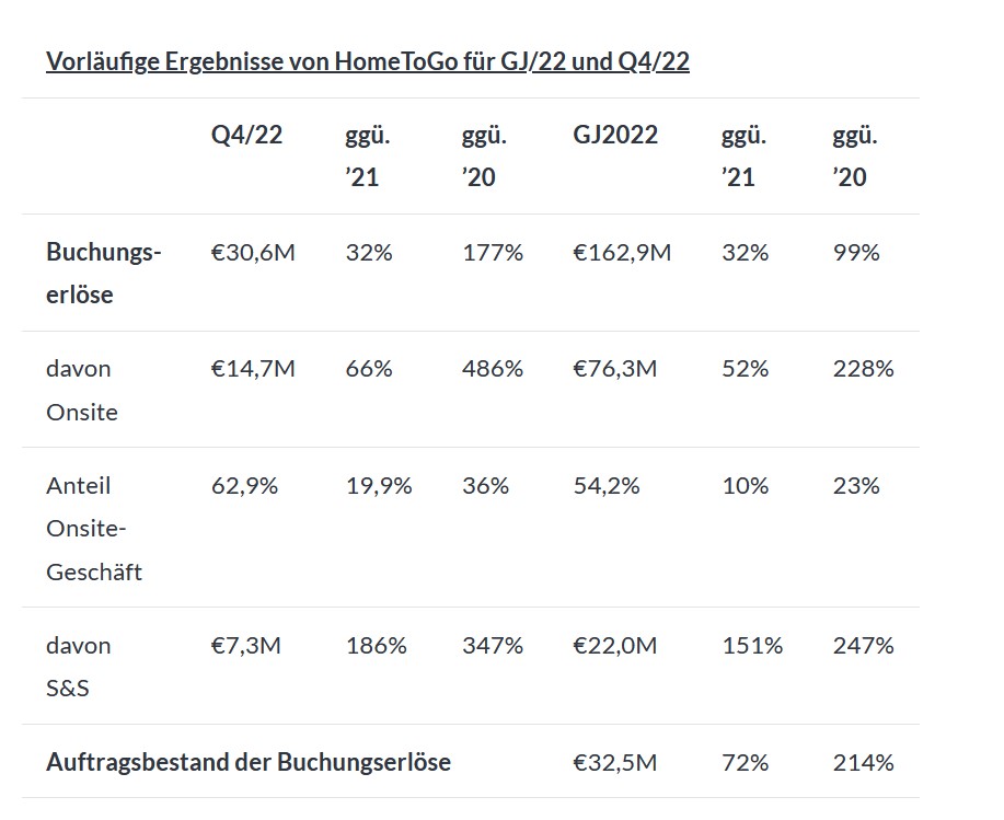 Angetrieben durch die Resilienz der robusten Reisebranche schloss HomeToGo das Jahr 2022 mit Rekordergebnissen ab, einschließlich vorläufiger Buchungserlöse von EUR 162,9 Mio. im Jahr 2022, was einem Wachstum von 32% ggü. dem Vorjahreszeitraum entspricht (EUR 123,6 Mio. im Jahr 2021).