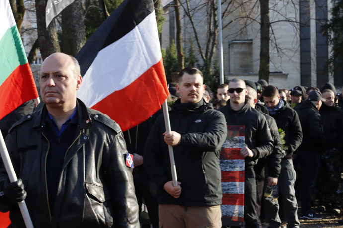 "UNGARN, 13.02.2016, Budapest - I. Bezirk. Gedenken des Ausbruchsversuchs deutscher und ungarischer Stadtverteidiger unter sowjetischer Belagerung am 11. Februar 1945 auf dem Kapisztrán-Platz vor dem Kriegsmuseum. Der blutig missglueckte Ausbruch gilt bei den Nazis als "Tag der Ehre". -Mitglieder der "Weissen Ungarischen Einheit" fordern ein "Freies, nationales und soziales Ungarn"