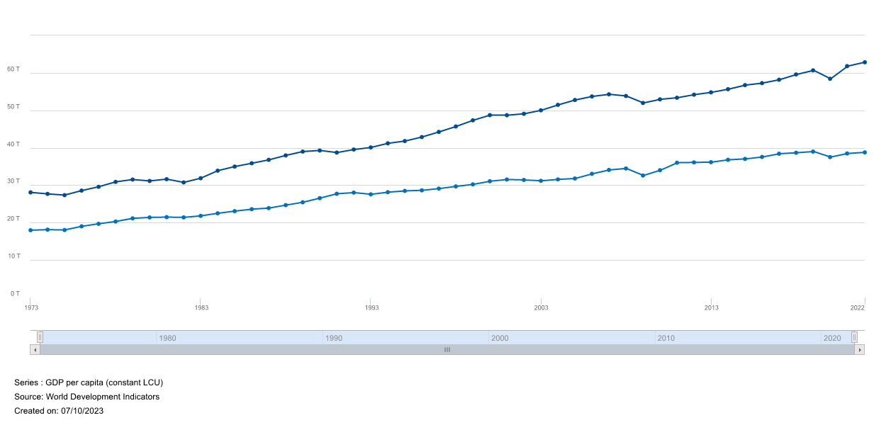 - "Das Bruttoinlandsprodukt je Erwerbstätigen (preisbereinigt) lag 2022 gerade mal zwei Prozent höher als 2015." (BIP pro Kopf tut nichts!)