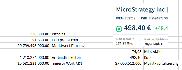 Bei deiner Berechnung vom inneren Wert vergisst du aber den Wert der Firma. Microstrategy ist eine Softwarefirma mit eigenen Produkten. Bitcoin handel war ursprünglich nur ein "Nebenschauplatz".