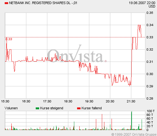 wie gesagt, pennystocks sind volatil, aber eines steht fest, der aufschwung ist deutlich da, wie sagte kosto noch, die total zusammengebrochenen werte haben bei der wende die größte chance der vervielfältigung, hebel ist ähnlich wie ein optionsschein! da der leitzins bei 5,25% belassen wurde in usa, denke ich sehen wir noch ganz andere kurse an den märkten...eine netbank könnte durch die übernahme noch ein absoluter turnaround werden!