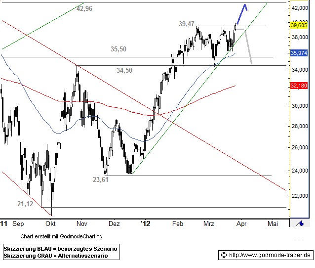 Sollte der Titel das Verlaufshoch aus dem Sommer 2011 bei 42 Euro überwinden können, dürfte es anschließend schnell in Richtung 50 Euro gehen.