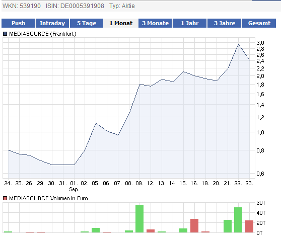 Letzte Woche mußte man glücklich sein Aktien von Mediasource noch unter 2 Euro zu bekommen diese Woche denke ich heißt es halt unter 3 Euro.