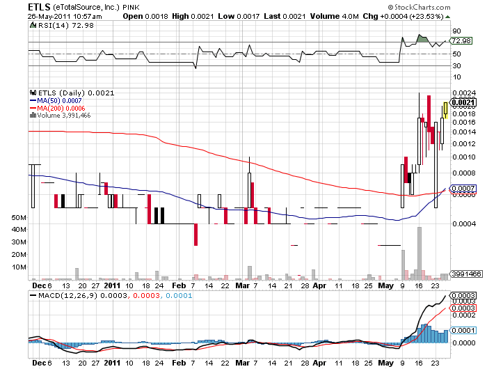 anfang. der chart hat verdammt große parallelen zu dem anstieg 2010. sieh dir das mal an. das ding fliegt uns die kommenden tage um die ohren. aber laut den super schlauen hier bin ich ja ein pusher. WNWG 2000% CDIPQ 1000% letzten monat. und ETLS ist die nächste.