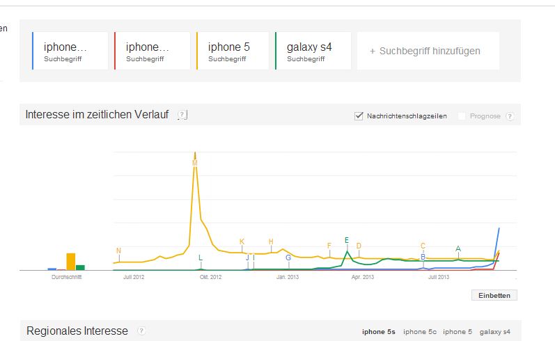 Bemerkenswert das selbst das iPhone 5C zum Einführungszeitpunkt im Internet so viel Resonanz hat wie das Galaxy S4 zum Einführungszeitpunkt. Das iPhone 5S liegt deutlich über dem Galaxy S4. Allerdings sind die Werte des iPhone 5 zum Einführungszeitpunkt im Jahre 2012 noch nicht erreicht, kann aber noch kommen da die Suchanfragen noch steigen: