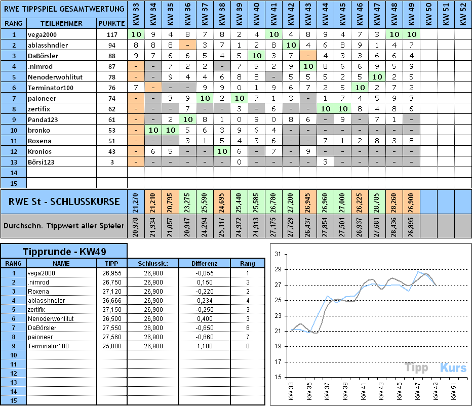 Eine wahrhaft düstere Woche liegt für alle RWE'ler zurück. Der Kursrutsch geht weiter und RWE ist die zweite Woche hinterenander rot. Wir werden sehen ob sich der Trend fortsetzt oder ob es wieder eine kleine Gegenreaktion gibt.