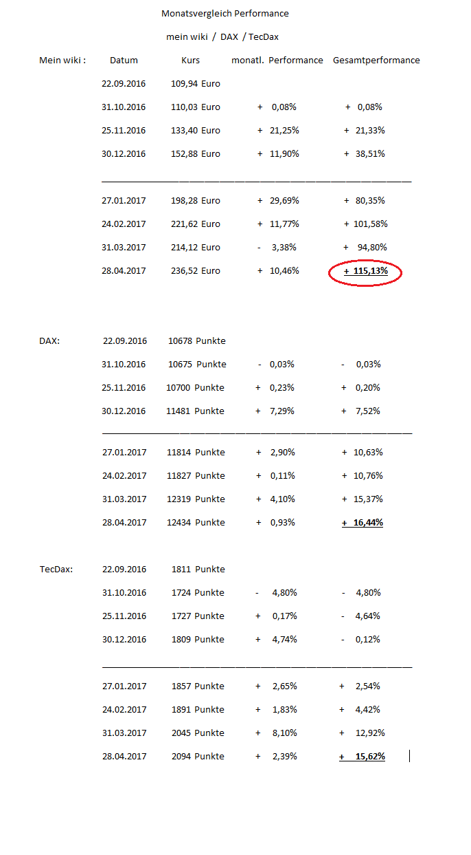 Nachdem ich im März leider gegenüber dem Gesamtmarkt federn lassen musste habe ich im April den Gesamtmarkt deutlich ouperformt. Wenn man die letzten beiden Monate zusammen nimmt konnte mein wiki auf der 2 Monatsbasis den Gesamtmarkt ebenfalls hinter sich lassen und eine bessere Performance erzielen.