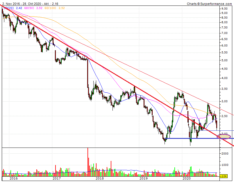vor ziemlich genau 5Jahren begann der Abwärtstrend Bei Kursen von 10,0-10,5 €.