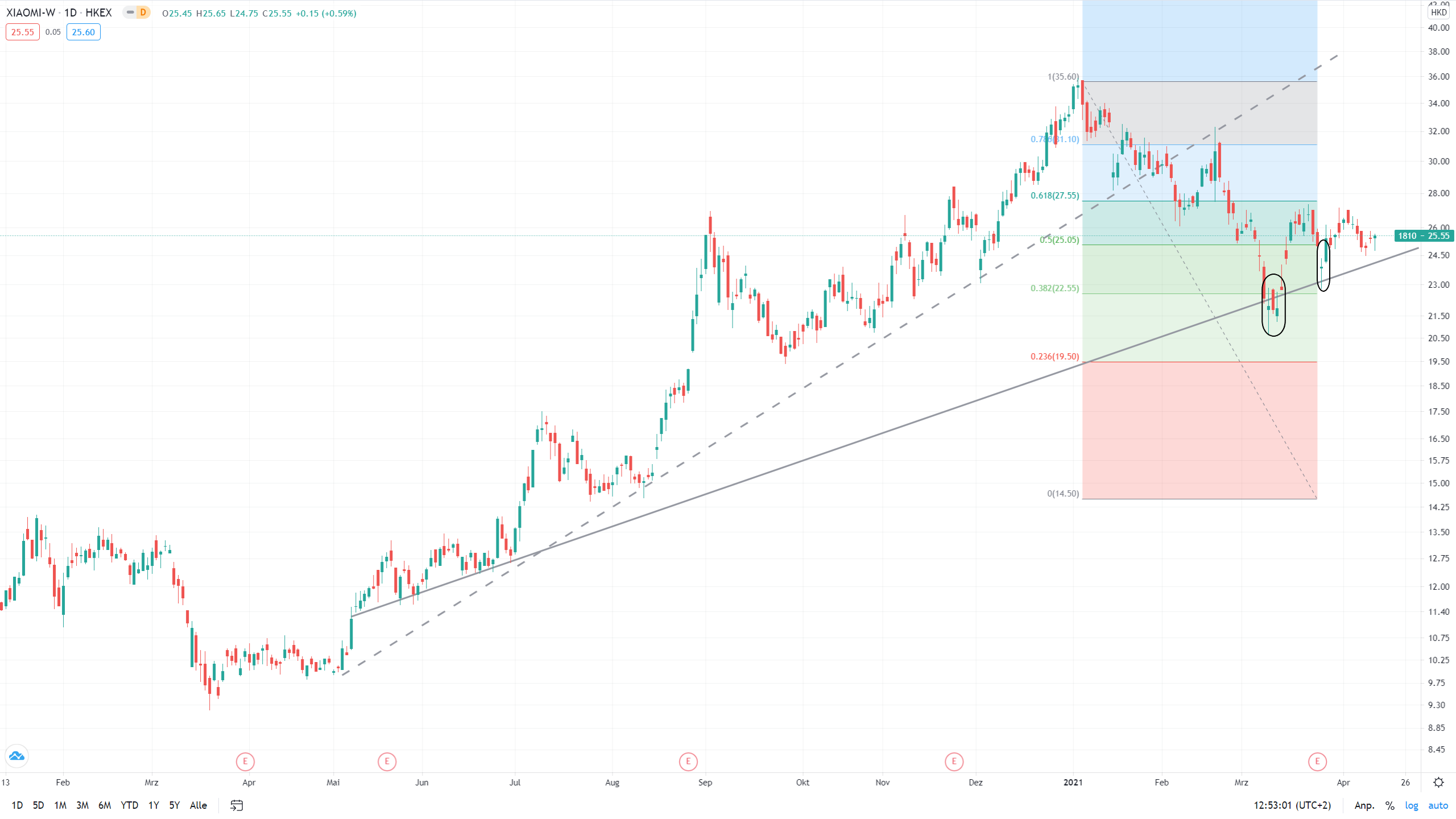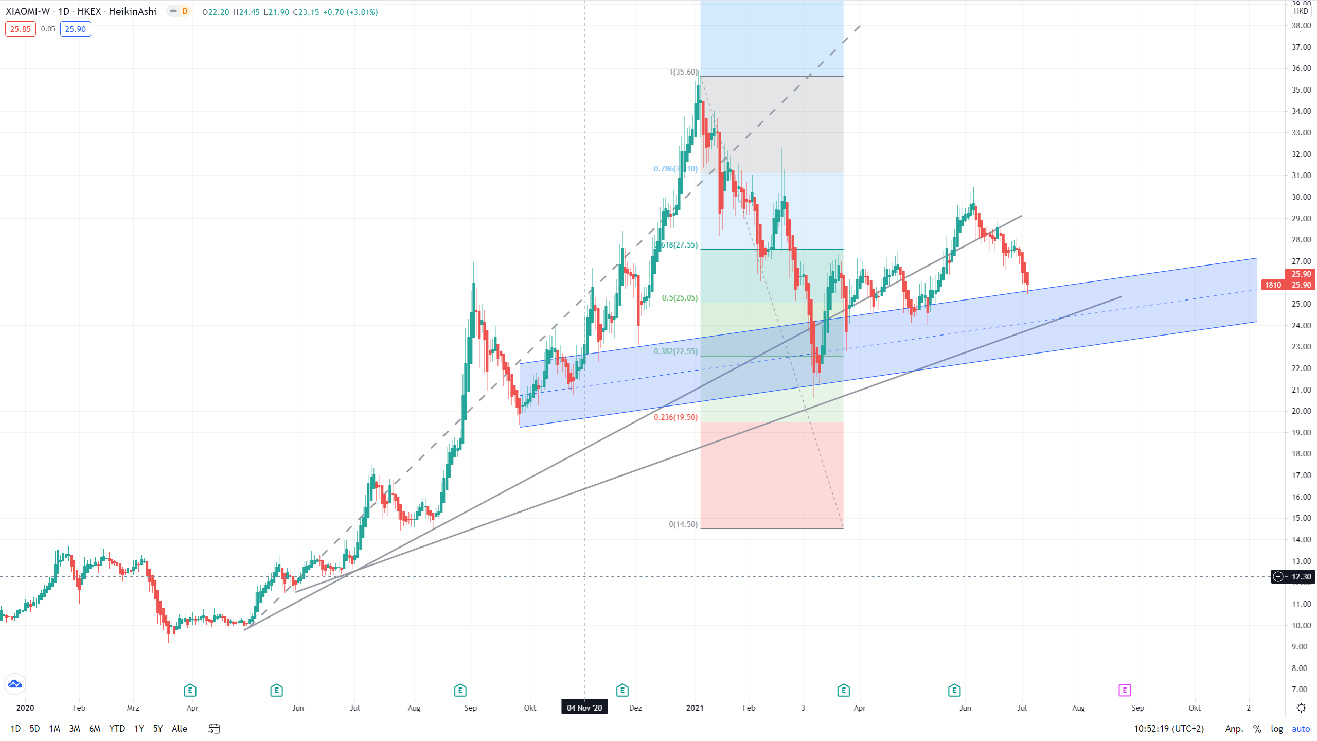 Der Kurs ist derzeit 27% von meinem Plan entfernt. Das heißt aber nicht, dass dies ein günstiger Kaufkurs ist, erstmal muss eine Entspannung her und das endgültige Urteil aus Xiaomis Klage kann noch dauern. Unabhängig davon gibt es im Hongkongchart noch zwei Gaps. Fällt der Wert noch mal unter die Trendlinie und wechselt sogar das Retrace, sollte man diesmal an SL´s denken.